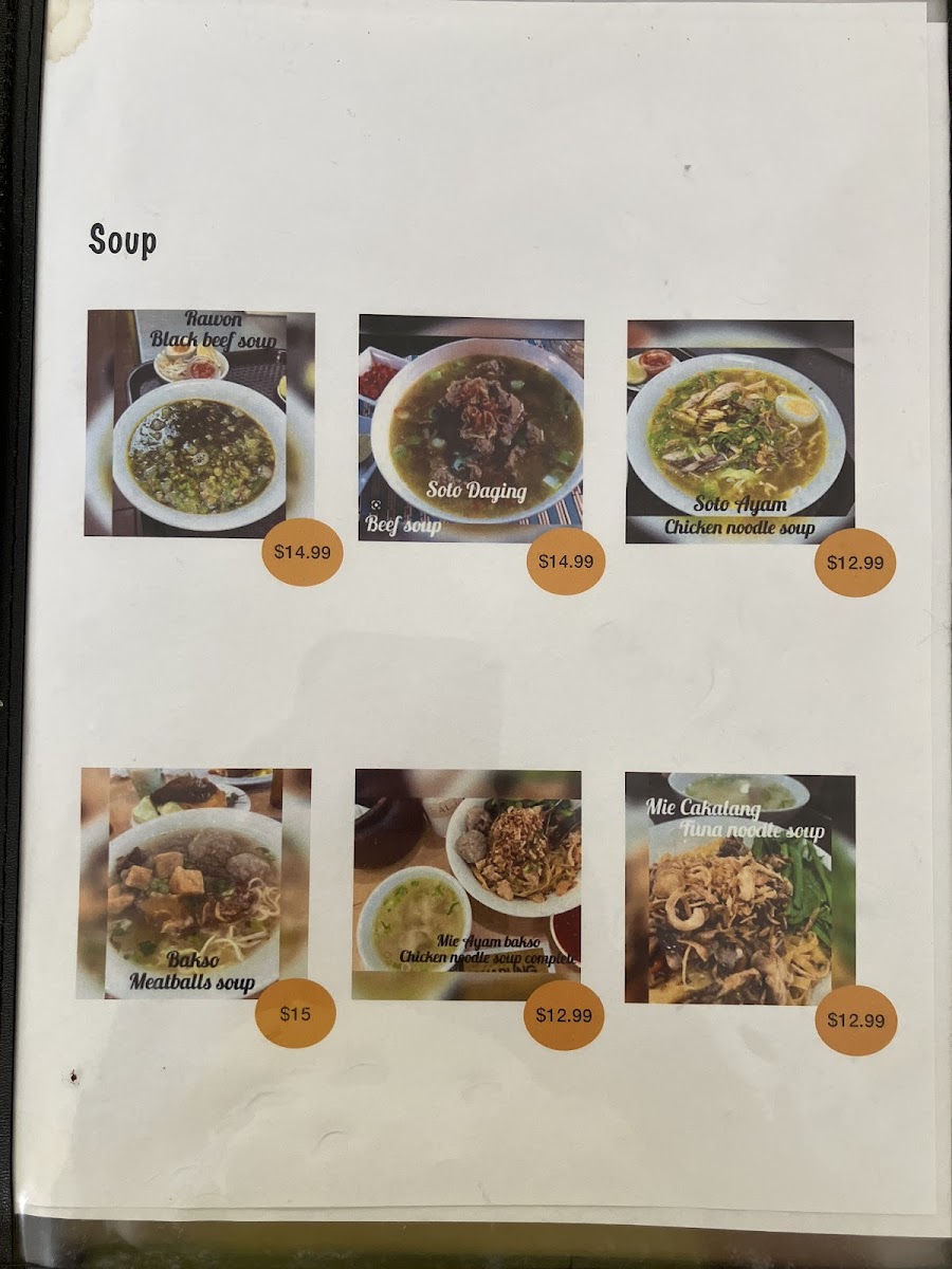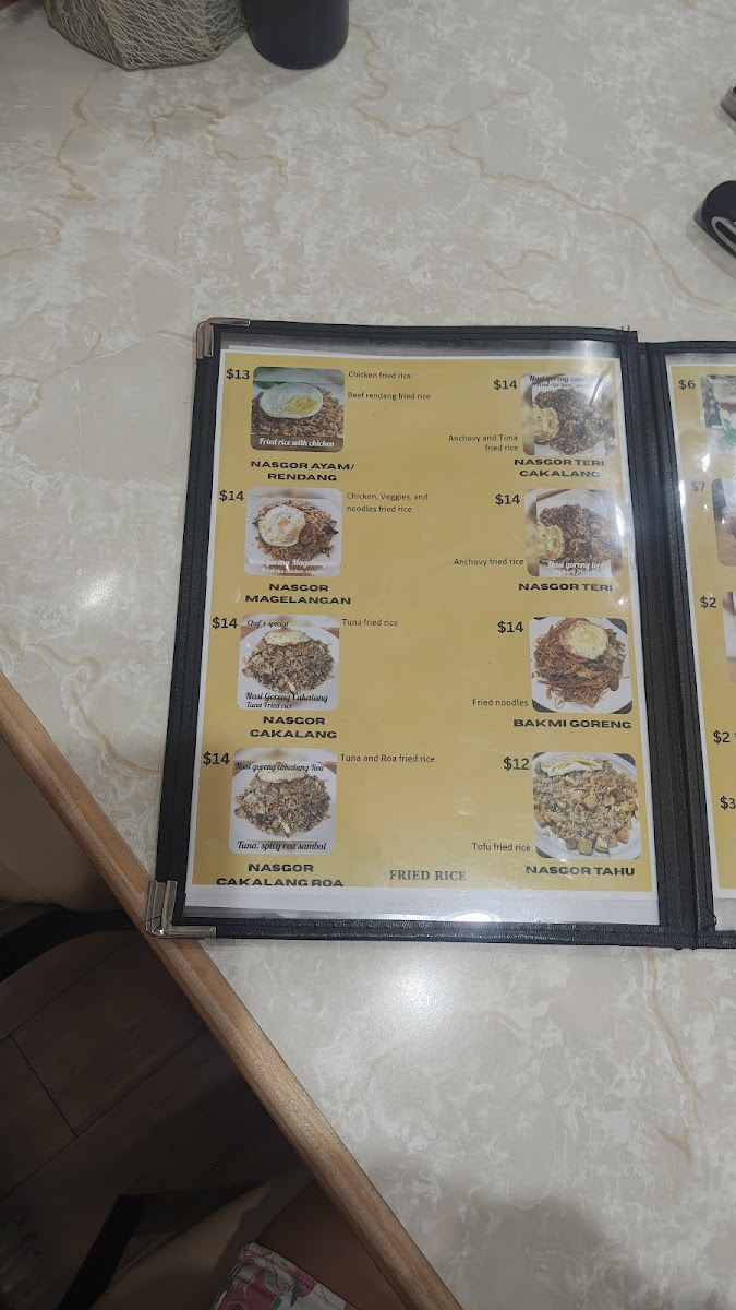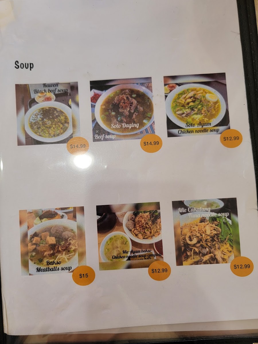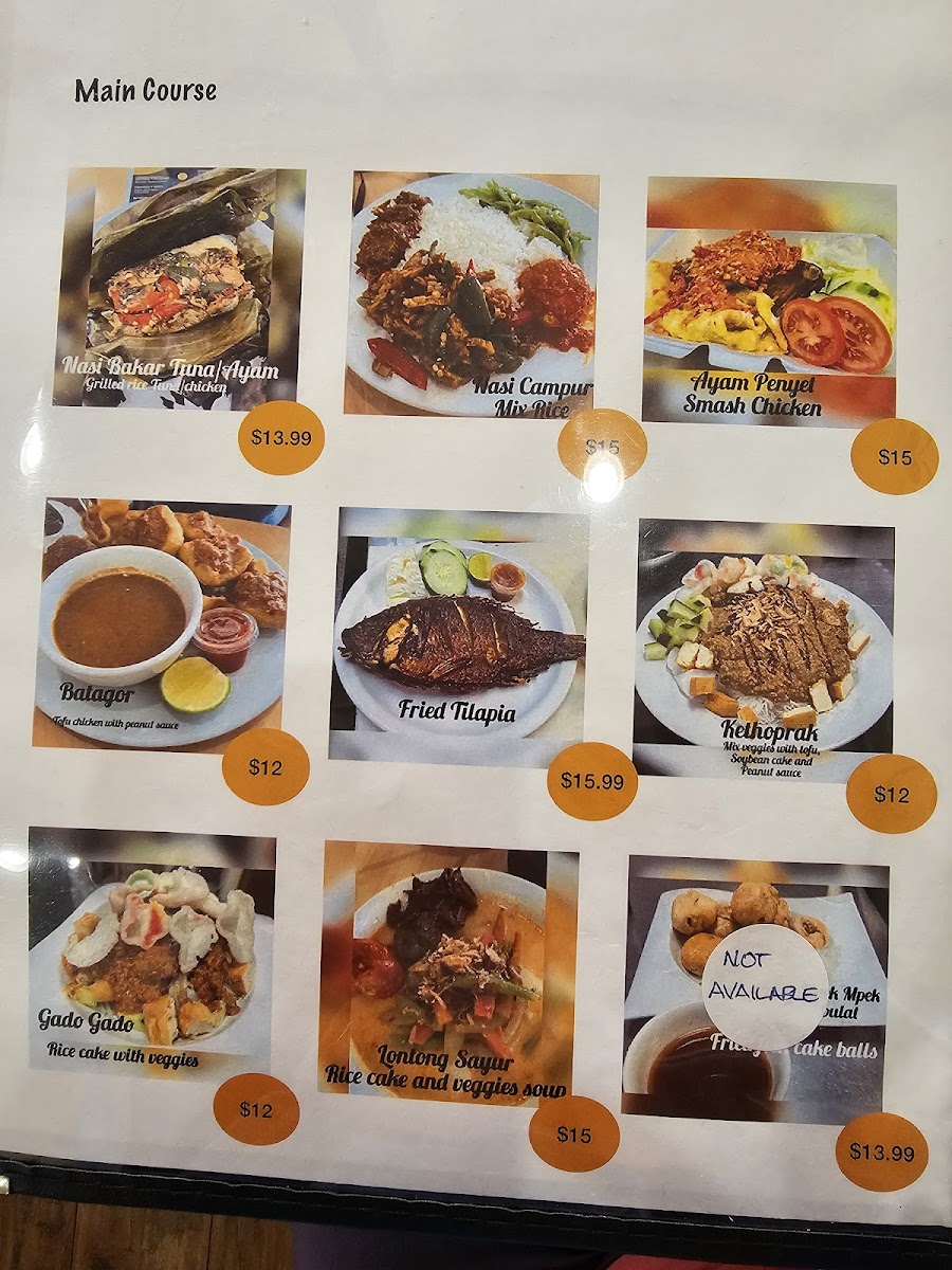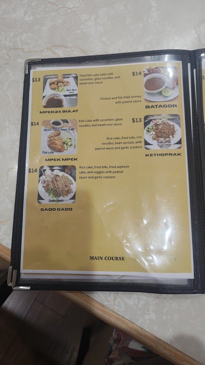 Main courses showcase iconic dishes such as Ayam Penyet, smashed chicken thigh paired with spicy chili and tofu sides, and the fragrant Nasi Bakar, where seasoned tuna or chicken is wrapped in banana leaves and grilled to perfection. Soups like Soto Ayam (chicken noodle soup) and Rawon (black beef soup) deliver deep, comforting flavors reminiscent of Indonesian street food.