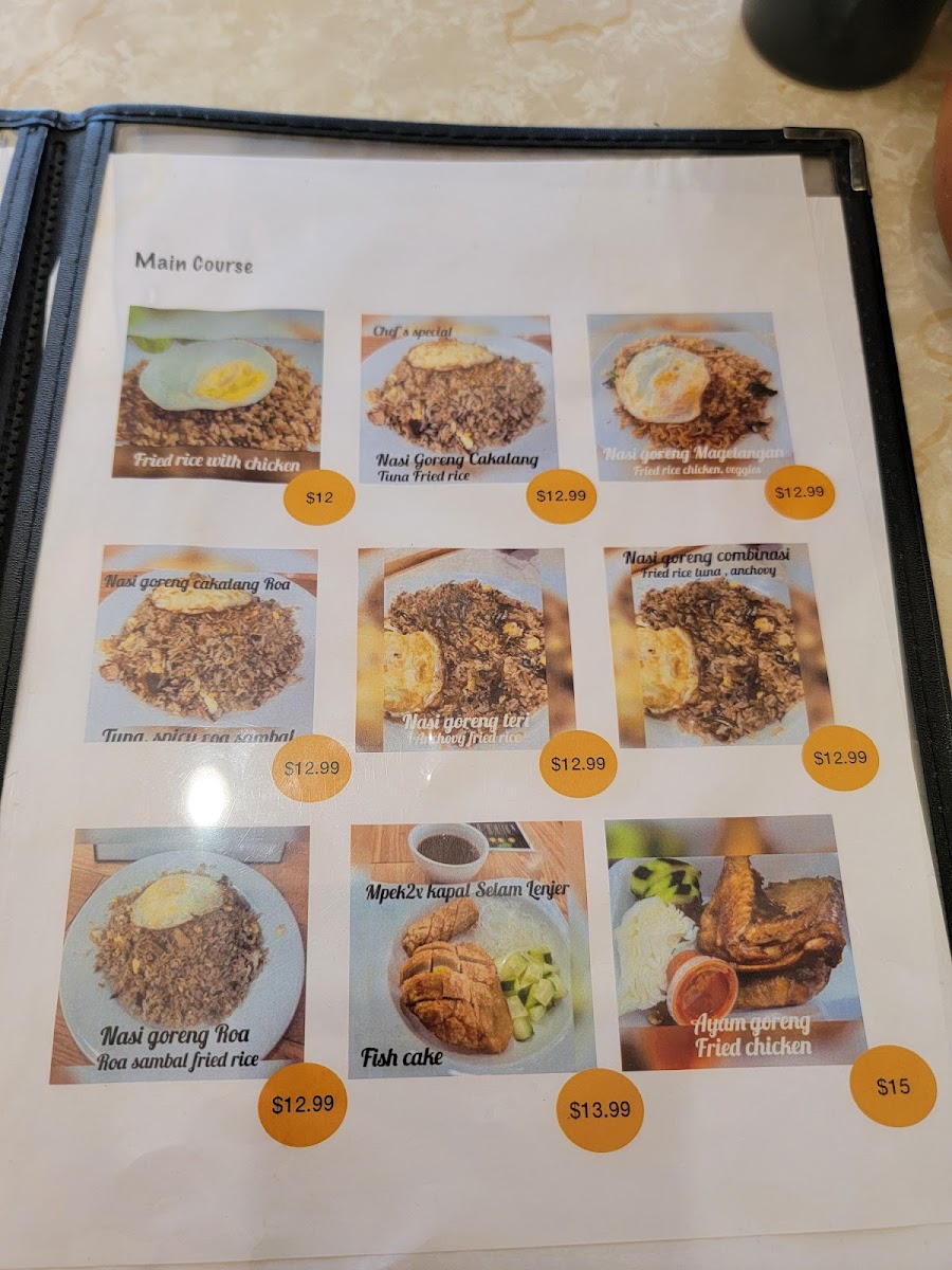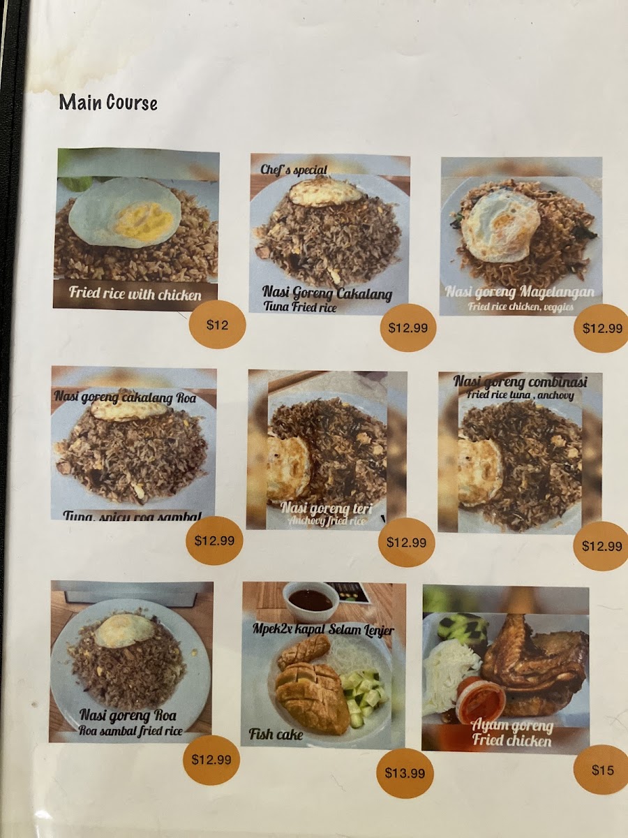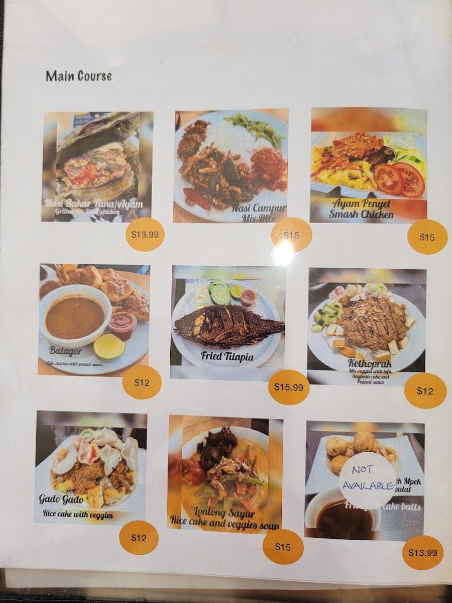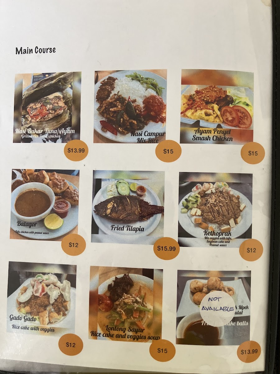 Main courses showcase iconic dishes such as Ayam Penyet, smashed chicken thigh paired with spicy chili and tofu sides, and the fragrant Nasi Bakar, where seasoned tuna or chicken is wrapped in banana leaves and grilled to perfection. Soups like Soto Ayam (chicken noodle soup) and Rawon (black beef soup) deliver deep, comforting flavors reminiscent of Indonesian street food.